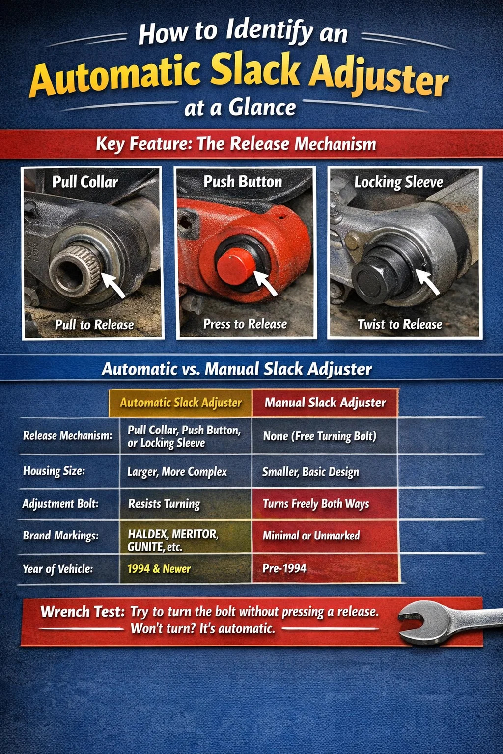 Регулювальний болт на автоматичному регуляторі слабини зазвичай трохи заглиблений у корпус або захищений фіксатором, а не повністю відкритий. Загальні шестигранні розміри 3/4" на блоках Haldex , 9/16" на більшості пристроїв Meritor , і 5/8" на агрегатах Gunite . На ручному регуляторі болт сидить повністю відкритим без будь-яких навколишніх деталей.