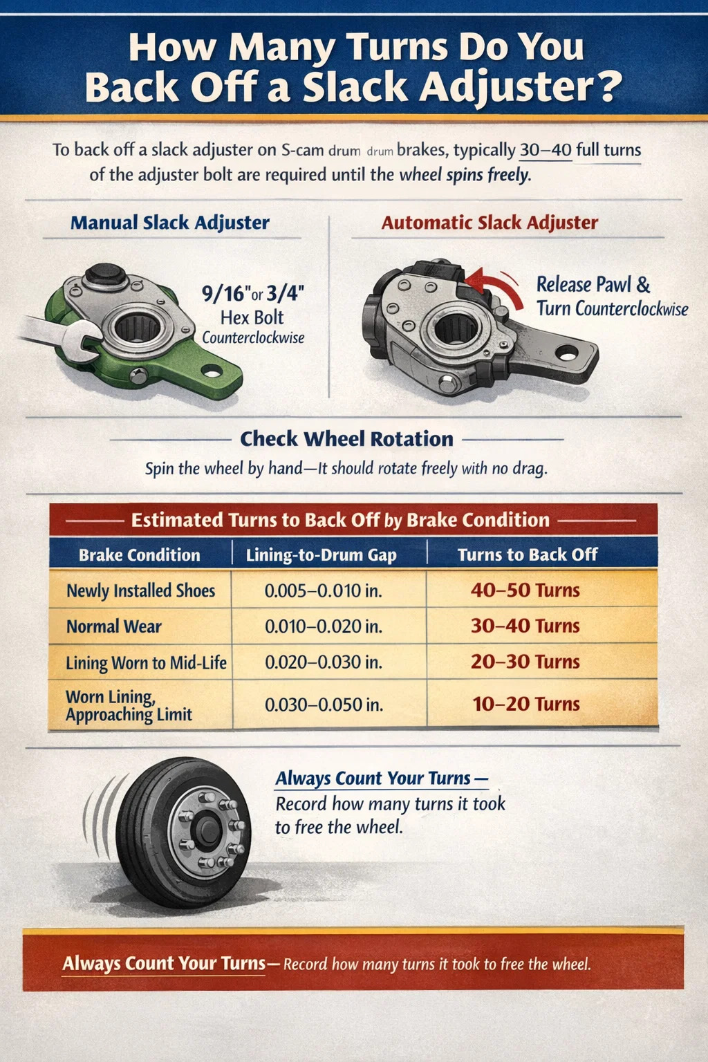 Стандартна процедура відключення регулятора провисання приблизно від 30 до 40 повних обертів гвинта ручного регулювання — або до тих пір, поки гальмівні колодки повністю не відступлять від барабана і колесо обертатиметься вільно без опору. Для автоматичних регуляторів провисання (АSA) процес звільнення дещо відрізняється: ви від’єднуєте механізм собачки та вручну вимикаєте регулятор, доки хід штовхача не буде в межах норми або гальма не від’єднаються від барабана. Точна кількість обертів залежить від марки, моделі та поточного стану регулювання гальма, але 30–40 обертів є надійною базою для більшості барабанних гальмівних систем із S-кулачком.