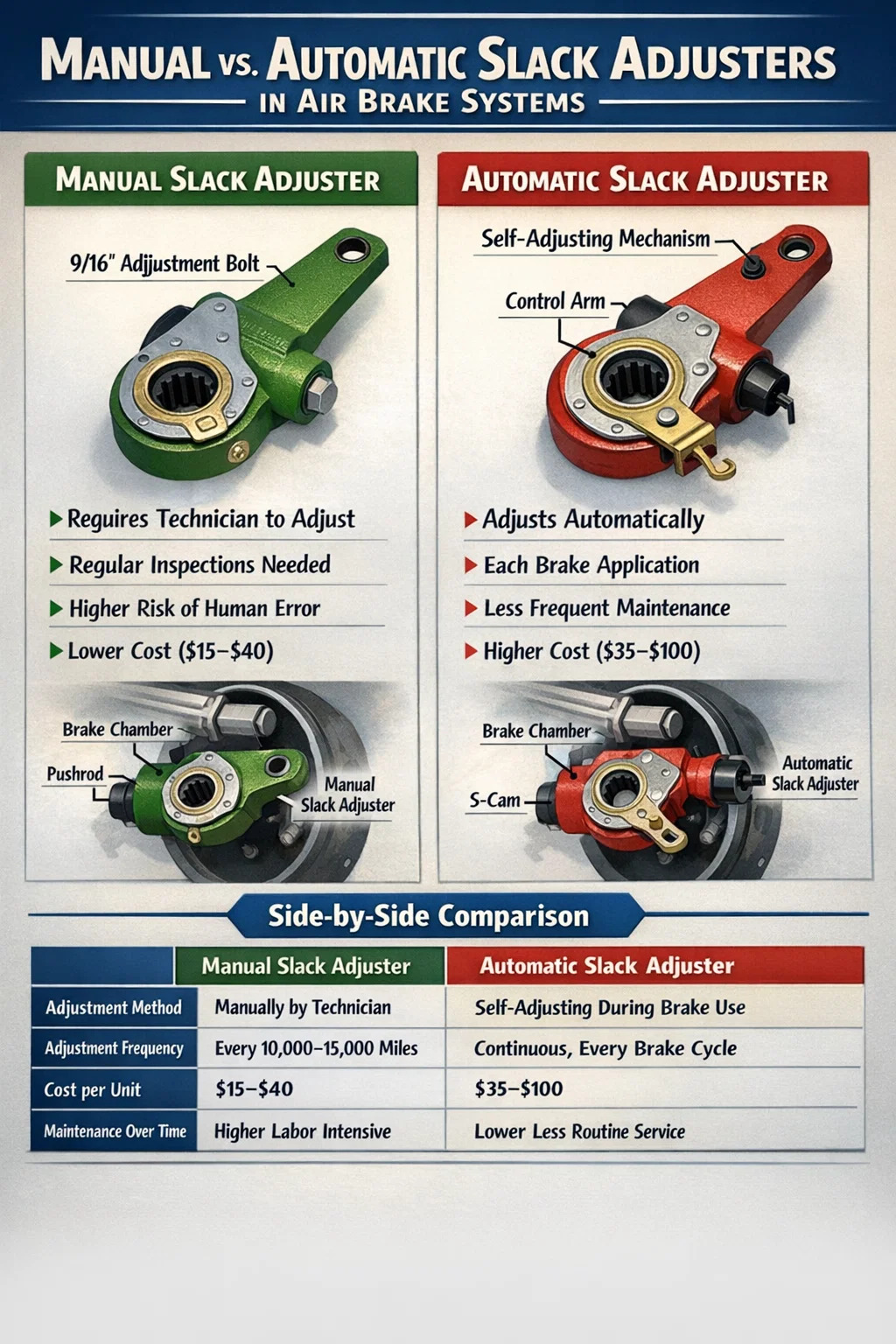 Розуміння обох типів має значення, незалежно від того, чи є ви менеджером автопарку, комерційним водієм, техніком з гальмівної системи чи тим, хто навчається на CDL. Федеральні правила відповідно до FMCSA 393.47 встановлюють суворі обмеження на хід штовхача, і непрохідна перевірка через невідрегульовані гальма може негайно зупинити автомобіль. Знання того, як працює кожен тип регулятора провисання — і що з кожним може піти не так — забезпечує сумісність транспортних засобів, безпеку їх руху.