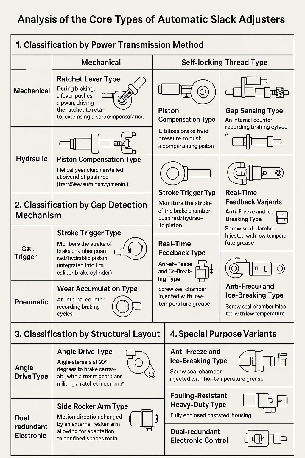 Тип важеля Ratchet: Під час гальмування важіль штовхає шапочку, приводячи до обертання односпрямовано, розширюючи гвинт, щоб компенсувати зазор (основна конструкція для вантажних автомобілів).