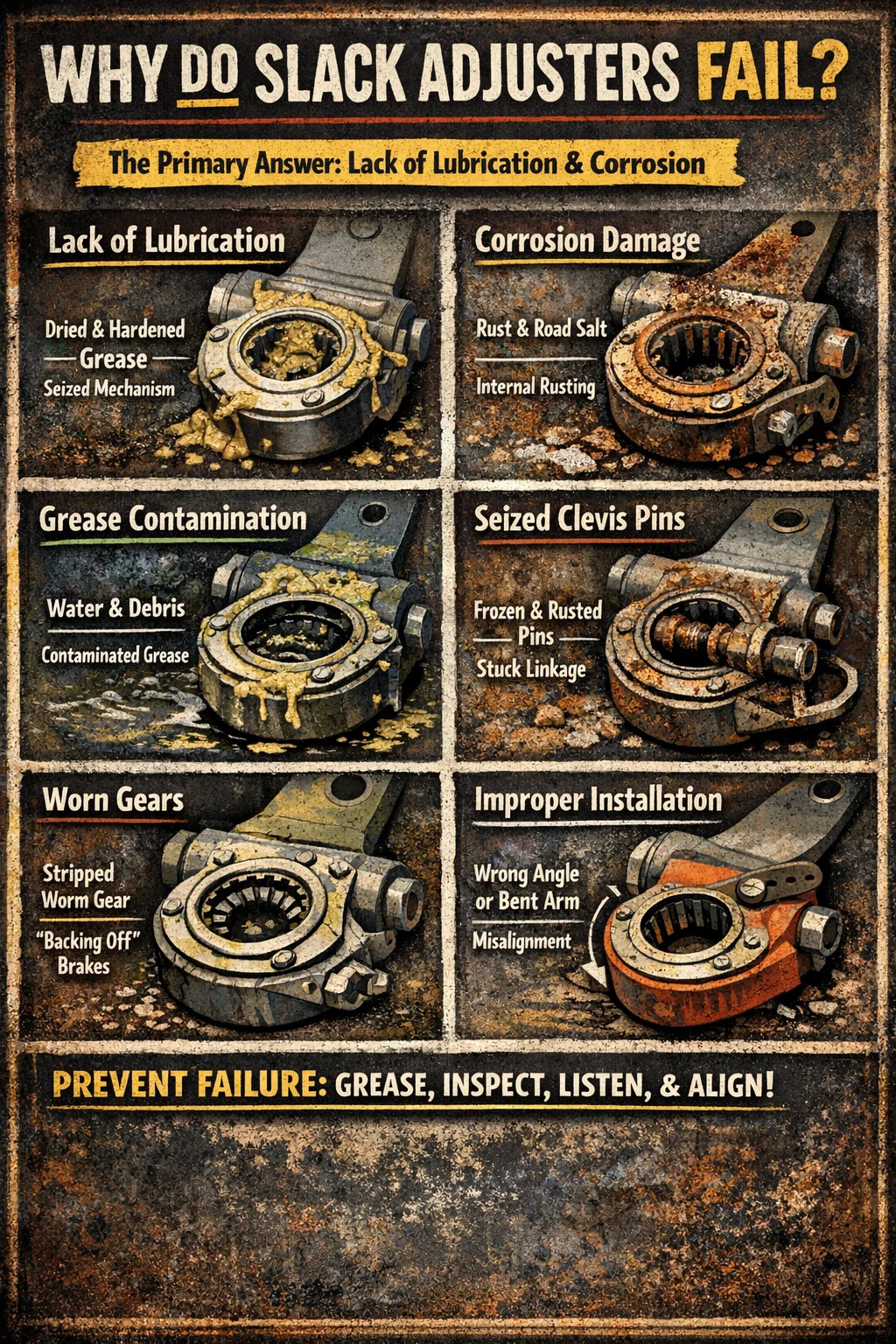 У переважній більшості випадків регулятори слабини виходять з ладу через відсутність регулярного змащення та корозію навколишнього середовища. Оскільки ці компоненти розташовані на нижній частині шасі, вони постійно піддаються бомбардуванню дорожнім сміттям, водою та їдкими антиожеледними хімікатами. Коли внутрішня мастило висихає або забруднюється, делікатний внутрішній храповий механізм заїдає або зношується, не даючи компоненту автоматично регулювати зазор гальмівних колодок. Вторинними причинами є внутрішній механічний знос шестерень і неправильне встановлення важеля керування.